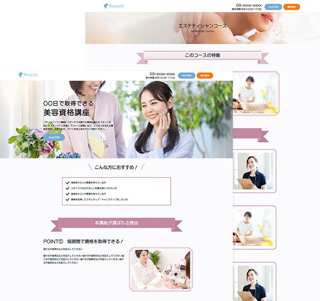 資格取得のための講座の紹介や講師の紹介、お申し込みまでできるコンテンツを配置したテンプレートです。資格取得系のページに必要な基本コンテンツで構成されたテンプレートなので、文章や画像を変えることであらゆる資格講座にご利用いただけます。