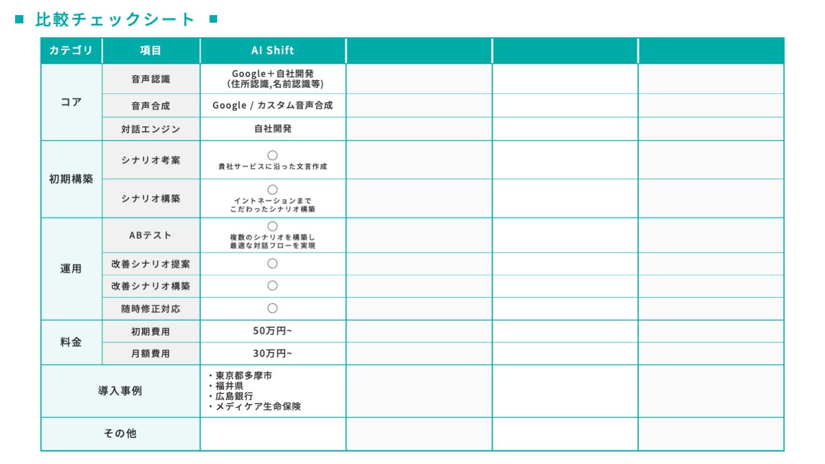こちらのフォーマットでは、ボイスボットに利用されているコア技術や、サポート体制・費用など、ベンダー選定において重要な項目を一覧で比較いただけます。