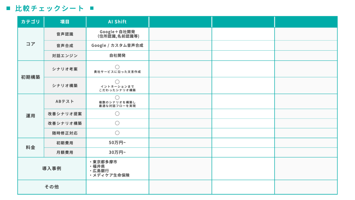 こちらのフォーマットでは、ボイスボットに利用されているコア技術や、サポート体制・費用など、ベンダー選定において重要な項目を一覧で比較いただけます。