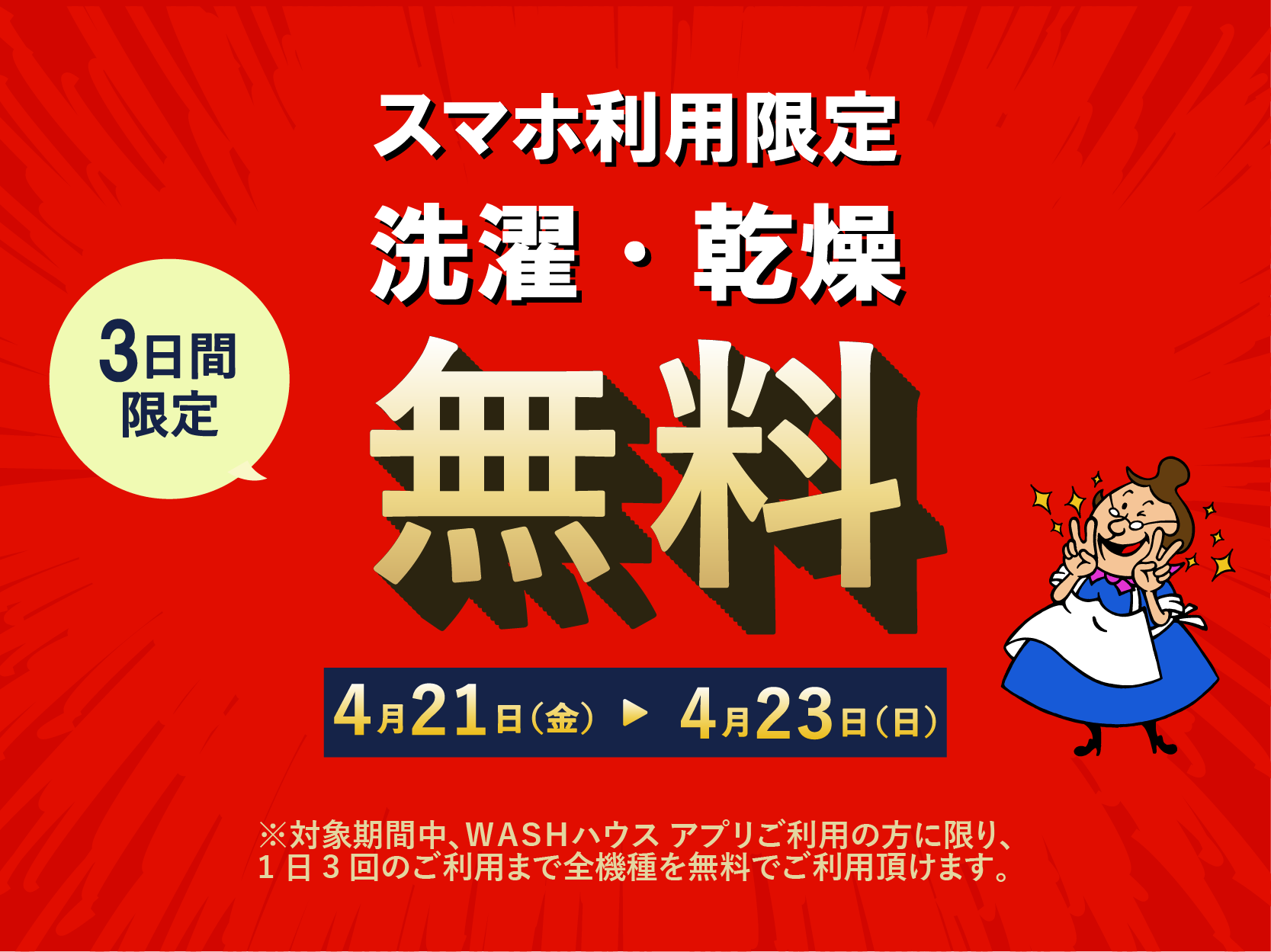 ・対象期間中、WASHハウスアプリご利用に限り、対象店舗の全機械*を無料でご利用いただけます