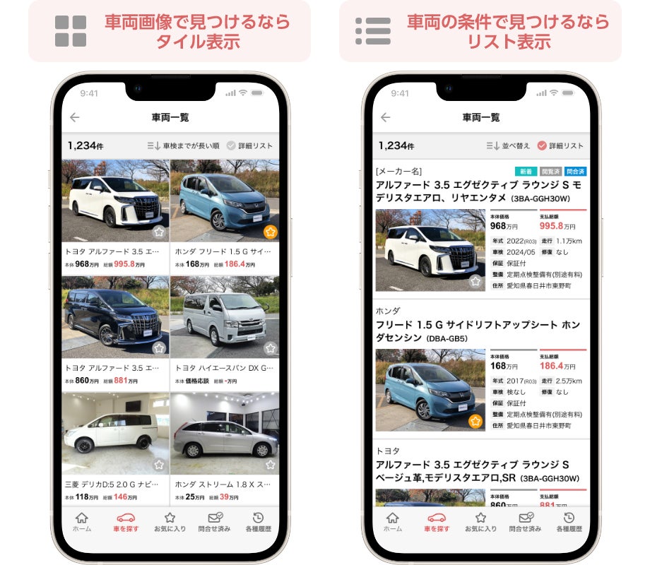 目的別で選べる2種類の検索リストをご用意。大きい車両画像で欲しいクルマが直感的に探せる「タイル表示」と、たくさんの車両情報を一度に見て比較できる「リスト表示」。目的に合わせて2種類の表示方法からご覧いただくことが可能です。