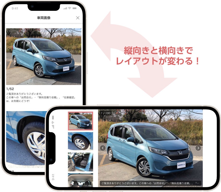 クルマの状態をしっかり確認したい場合は、車両画像専用モードがおすすめです。アプリなら縦向きと横向きで違ったレイアウトでご覧いただくことが可能です。縦向きは全ての画像をより素早く。横向きでは写真を1枚ピックアップしてより細かくチェックできます。