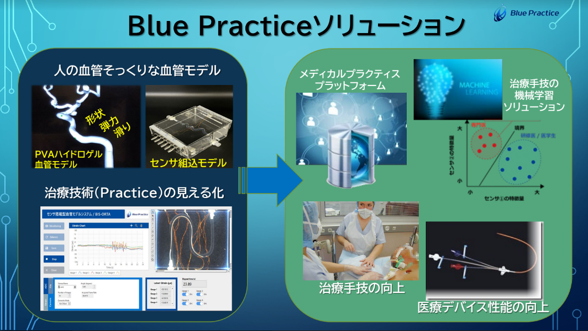 Blue Practice社は東北大学流体科学研究所/太田研究室、ならびに東北大学大学院医工学研究科/芳賀研究室による長年の研究実績と内閣府革新的研究開発推進プログラム(ImPACT)「バイオニックヒューマノイドが拓く新産業革命」の支援による研究成果に基づき、2019年2月にスタートアップ企業として設立されました。その高い研究開発レベルを活かして、今後ますますその重要性が高まる医療とヘルスケア領域における医師の技術レベルの向上と医療デバイスの品質向上に貢献すべく、グローバルな事業展開を進めています。