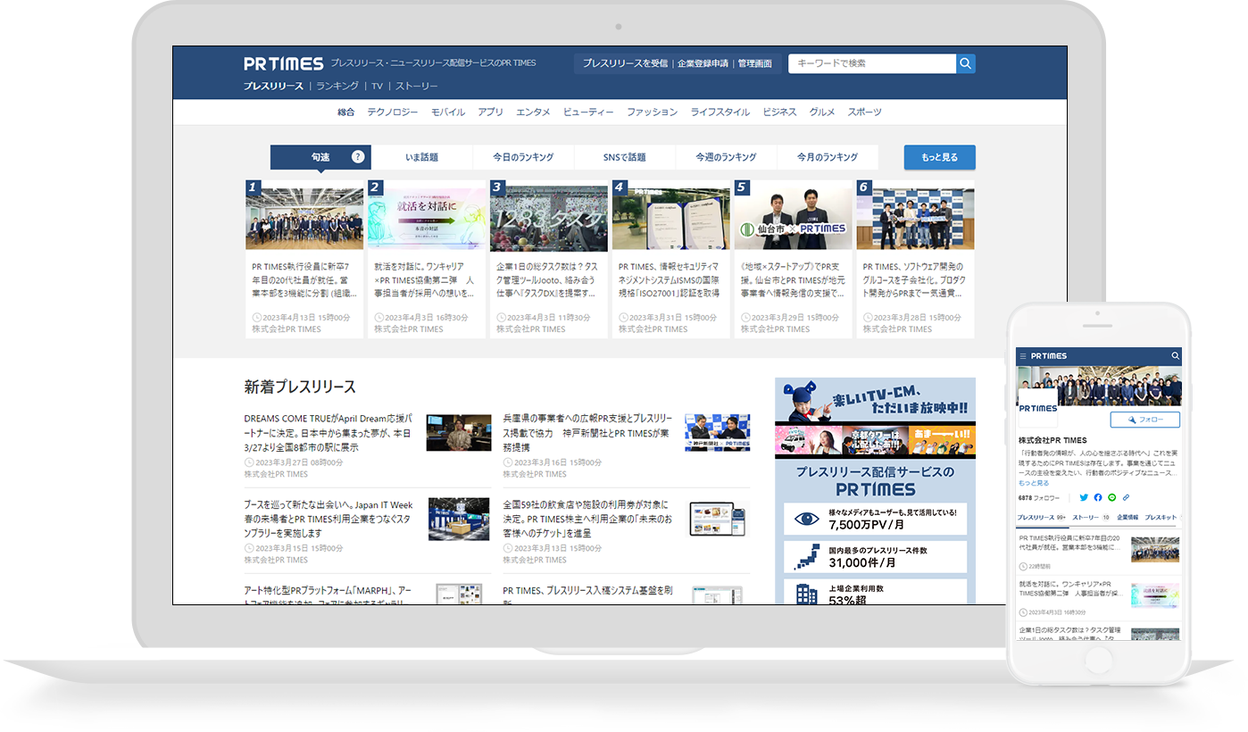 PR TIMES(読み:ピーアールタイムズ)は、「行動者発の情報が、人の心を揺さぶる時代へ」をミッションに掲げ、「行動者」のポジティブな情報がニュースの中心となり、個人を勇気づけ前向きにする社会の実現に挑んでいます。私たちは人の行動や頑張りの結晶を、その想いを紡いで発表するのがプレスリリースだと考え、企業規模を問わず「行動者」が自ら発信できる、PRの民主化を目指して事業を展開しています。プレスリリース配信サービス「PR TIMES」の利用企業社数は7万9000社を超え、国内上場企業の53%超に利用いただいています。情報収集のため会員登録いただくメディア記者2万5000人超、サイトアクセス数は月間約7500万PV、プレスリリース件数は月間3万件超、累計で100万件を超えています。全国紙WEBサイト等含むパートナーメディア230媒体以上にコンテンツを掲載しています(2023年2月時点)。