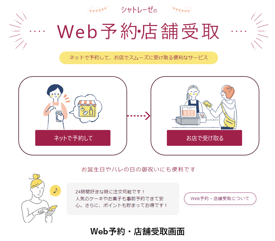 今回の3サイト統合によりシャトレーゼ公式サイトには通常のECサイトとしての通販商品購入機能だけでなく、Web予約サイトとしての機能も付与され、シャトレーゼ公式サイトを通してシームレスに店舗受取も行えるようになりました。