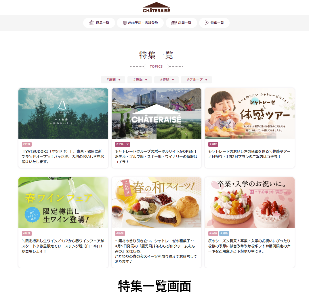 今回のリニューアルでは、ECサイトだけでなく、情報を発信するメディアコマースとしてサイトを統合しました。季節のおすすめ商品やキャンペーン・イベント情報、シャトレーゼの素材・製法へのこだわりや取り組みなど、商品を販売するだけのサイトではなく、ファンがより楽しめる情報を得ることができるサイトになっております。