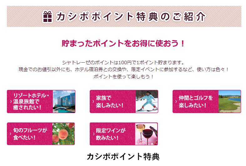 このカシポポイントは、商品購入の際に1ポイント1円の値引きに利用できるだけでなく、シャトレーゼグループの提供するリゾートホテルや温泉旅館への宿泊券(700pt~)、スキー場の利用券(300pt~)、ゴルフ場利用券(1500pt~)やその他限定イベントなどの特典と交換することが可能です。
