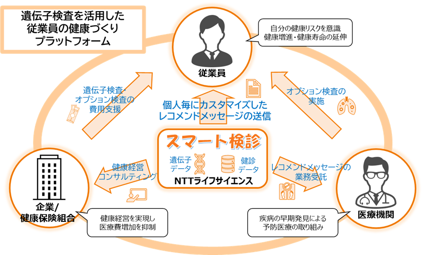 NTTグループは、メディカル・ヘルスケアの分野において、さまざまなデータを活用し、個別最適なサービスの提供を通じて、Well-beingな社会の実現をめざしています。NTTライフサイエンスは、「スマート検診」のサービス化により、人間ドックなどを通じて医療機関が保有する健康診断結果と遺伝子検査結果を組み合わせ、個人に必要かつ最適な検査情報をレコメンドすることで、疾患の予防・早期発見に導き、個人のWell-being実現に寄与します。