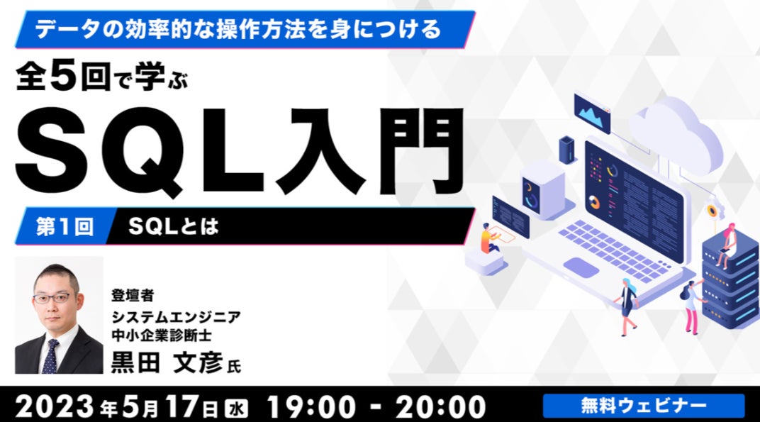 SQLは、「シークェル」または「シーケル」と呼ばれる、世界で最も普及しているデータベース言語のひとつです。ISO(国際標準化機構)で規格が標準化されている言語であり、データベースの定義や操作を行うことができます。昨今、デジマやデータ活用が声高に叫ばれていますが、その業務においては基礎的な技術であるSQLの理解が欠かすことができません。今回スタートするセミナーシリーズ「全5回で学ぶSQL入門」では、“SQLとは何か”といった基礎的な知識から、基本的な命令文、データベースの構造、データベースからデータを取り出すための構文の使い方にいたるまで、SQLの操作方法について解説してまいります。また、シリーズの第3回以降では、演習に取り組んでいただきながら、SQLの操作方法の基礎を学んでいただく予定です。