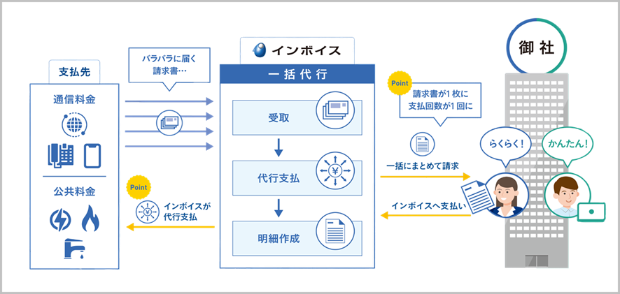 毎月、事業社ごと、拠点ごと、利用期間ごとに届く、通信費や水光熱費の請求書をインボイスがお客様の代わりに受領。お支払いを代行し請求書を1本化してクラウド上でお届けするサービスです。
