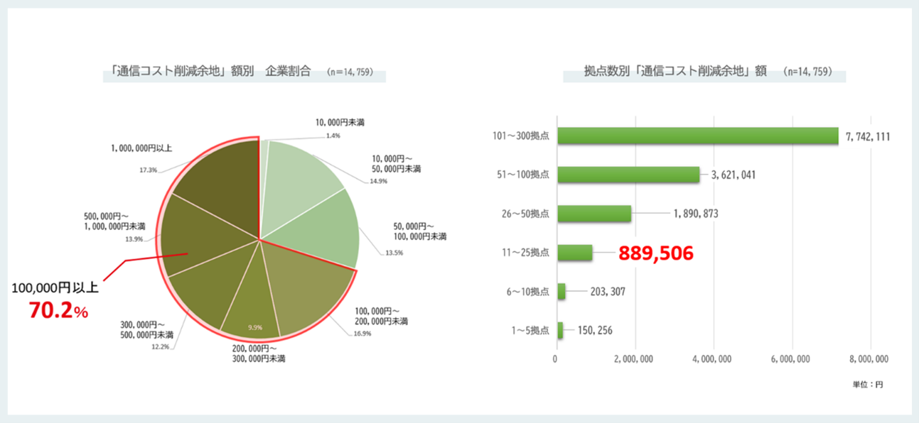 実際にインボイスが提供する「Gi通信」利用顧客を分析したところ、98.3%の企業に削減効果が期待でき、70%以上が年間10万円以上の削減余地があることが確認できました。また、企業の拠点数別の削減余地をみると、11~25拠点だと年間約90万円、拠点数が多いほど削減余地が大きいことが確認できます。