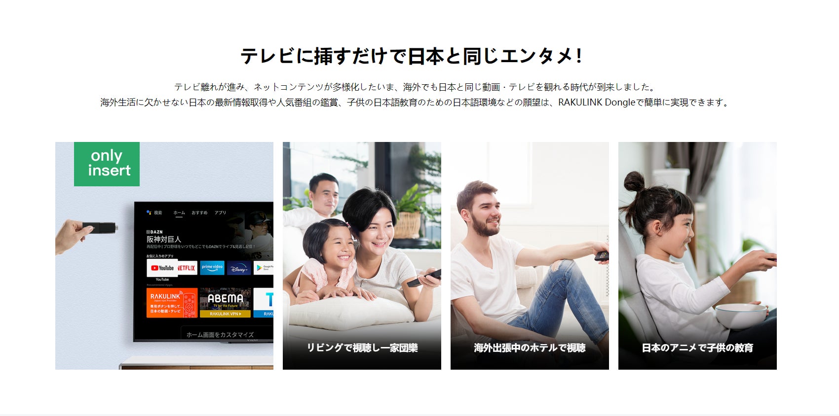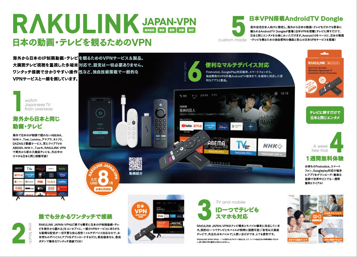 RAKULINK日本VPNは、海外赴任・留学・移住・出張・旅行者の日本人向けに、誰でも海外から日本のIP制限動画・テレビを簡単に観るための日本VPNアプリと製品。