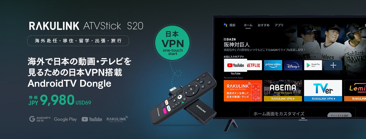 そんな日本国内しか視聴できない人気の動画コンテンツを、海外でも簡単に視聴したいニーズに応えて、海外から日本IP制限動画・テレビを大画面テレビで簡単に観るための4K AndroidTV Dongle「ATVStick S20」、並びにマルチデバイス対応の日本VPNサービス「RAKULINK」が企画・開発された。