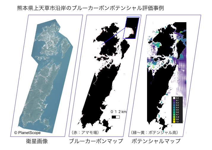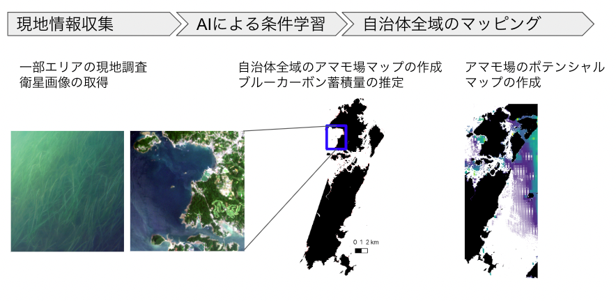 今回、上天草市においてはアマモ場を対象として調査を行うことで、自治体全域のアマモ場マップ、ブルーカーボン蓄積量推定、ポテンシャルマップの作成を行いました。これにより、今後の自治体の計画策定や、ブルーカーボンに関心の高い企業との官民連携加速に活用可能な地図情報を作成することが出来ました。