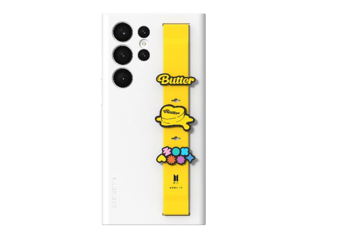 「Galaxy S23 Silicone Grip Case」、「Galaxy S23 Ultra Silicone Grip Case」の背面に付け替えが可能なストラップです。BTSのButterをモチーフとしたデザインが施された柔らかな質感のストラップにより、スマートフォンを手に固定させることで、片手でも安心してスマートフォンの操作が可能です。