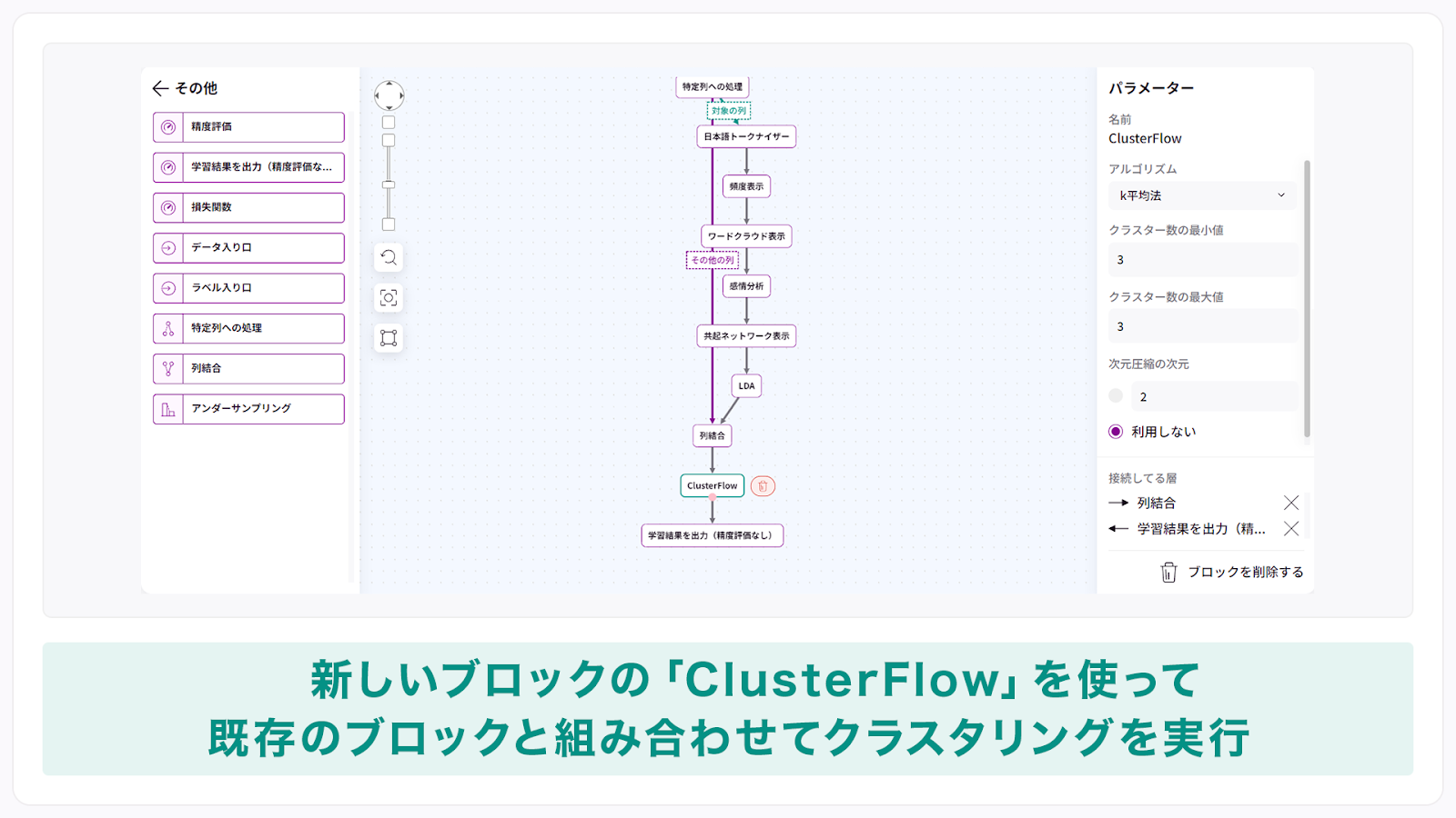 クラスタリング機能「クラスターフロー」は、膨大なデータの中から類似性の高いデータをグループ分けする「クラスタリング」を、ノーコードで扱うことができる機能です。データにラベル付けを行うアノテーション作業は不要で、クラスタリングが可能。その結果を2次元の分布図に描画することで、データの分布を可視化することができます。これらにより、データ分析にかける時間を短縮しながら、ビジネス活用を促進します。