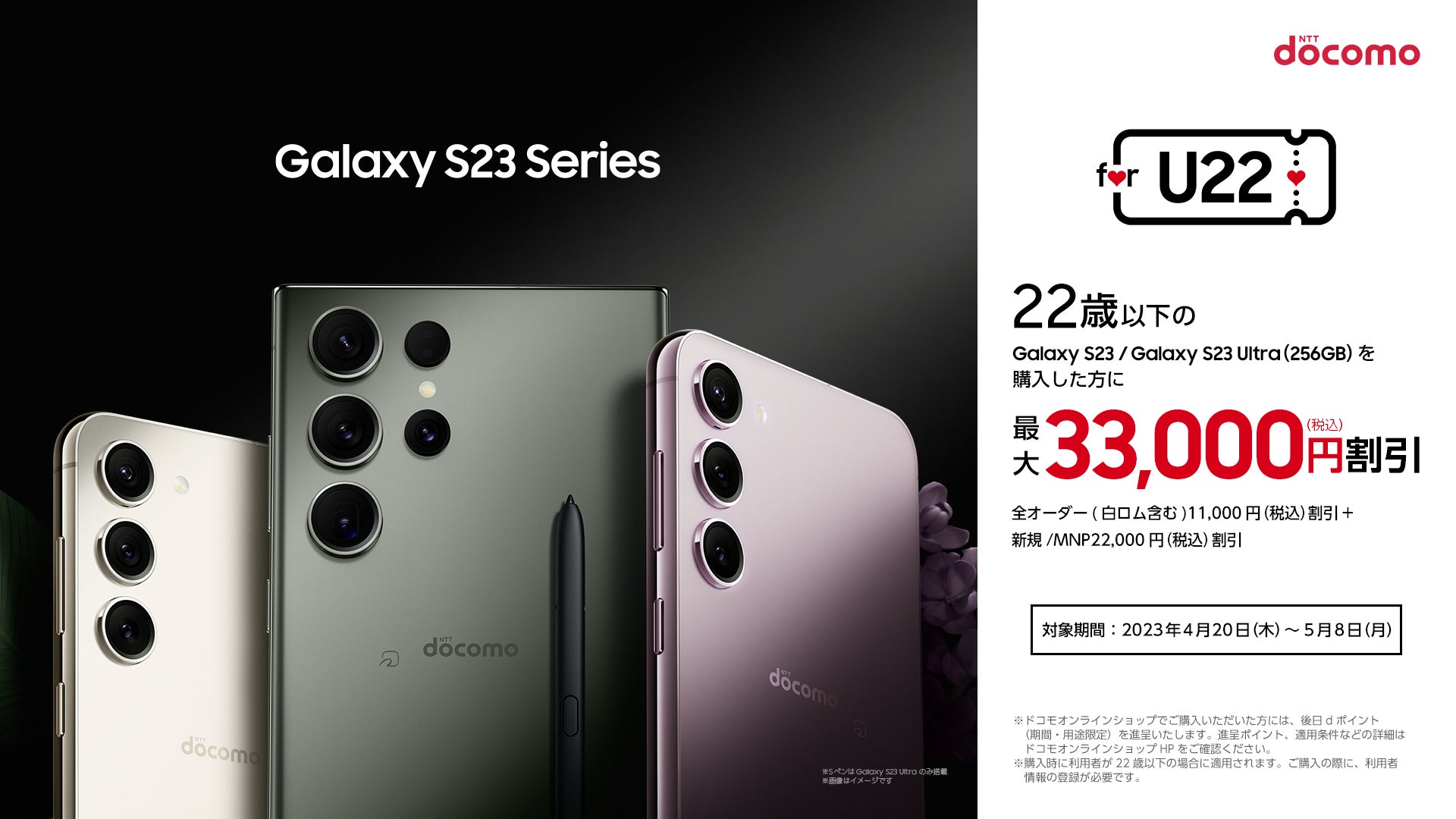 また、22歳以下※2のお客様限定で、「Galaxy S23(256GB)」、「Galaxy S23 Ultra(256GB)」が最大33,000円(税込)割引となる「U-22限定割引キャンペーン」※3を開催いたします。最新スマートフォン「Galaxy S23(256GB)」、「Galaxy S23 Ultra(256GB/512GB※1)」をぜひご検討ください。