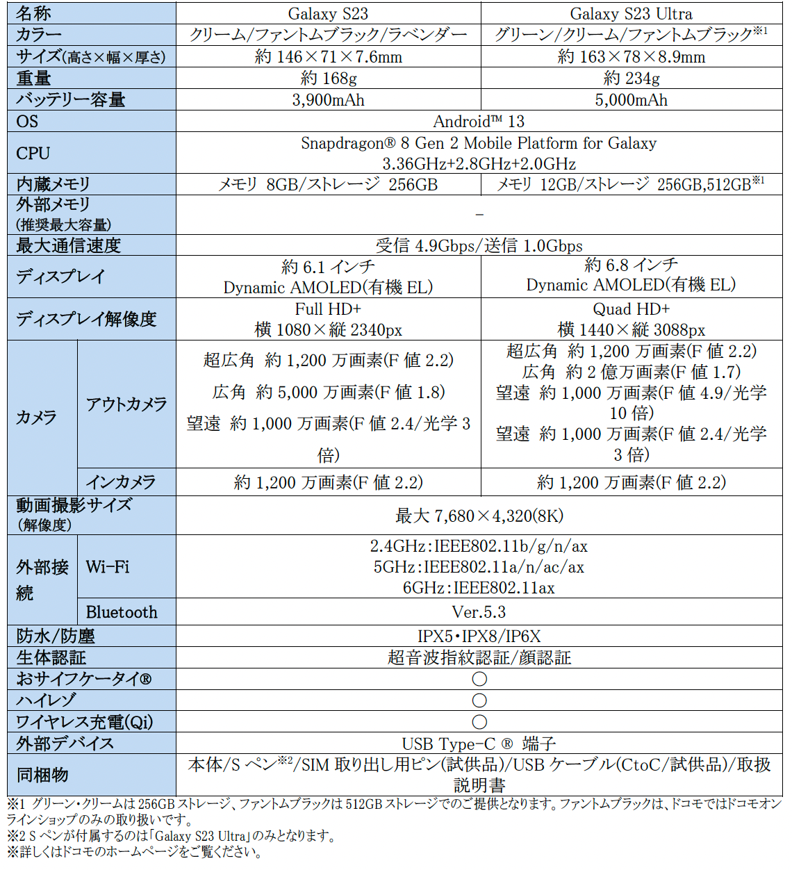 「Galaxy S23(SC-51D/256GB)」「Galaxy S23 Ultra(SC-52D/256GB)」