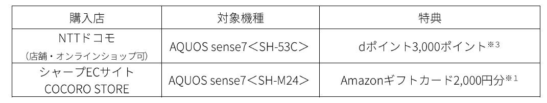 期間中(2023年4月20日(木)~2023年5月21日(日))に、NTTドコモまたは当社のCOCORO STOREにて「AQUOS sense7」をご購入の上、専用サイトからご応募(※1)いただいたお客様に、dポイント3,000ポイント(NTTドコモの場合)、またはAmazonギフトカード 2,000円分(当社のCOCORO STOREの場合)をもれなくプレゼントします。