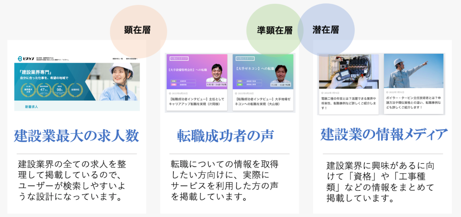 ビズケンは転職をしている方(転職顕在層)とこれからする方(転職潜在層)が月間10万人ほど集まっています。