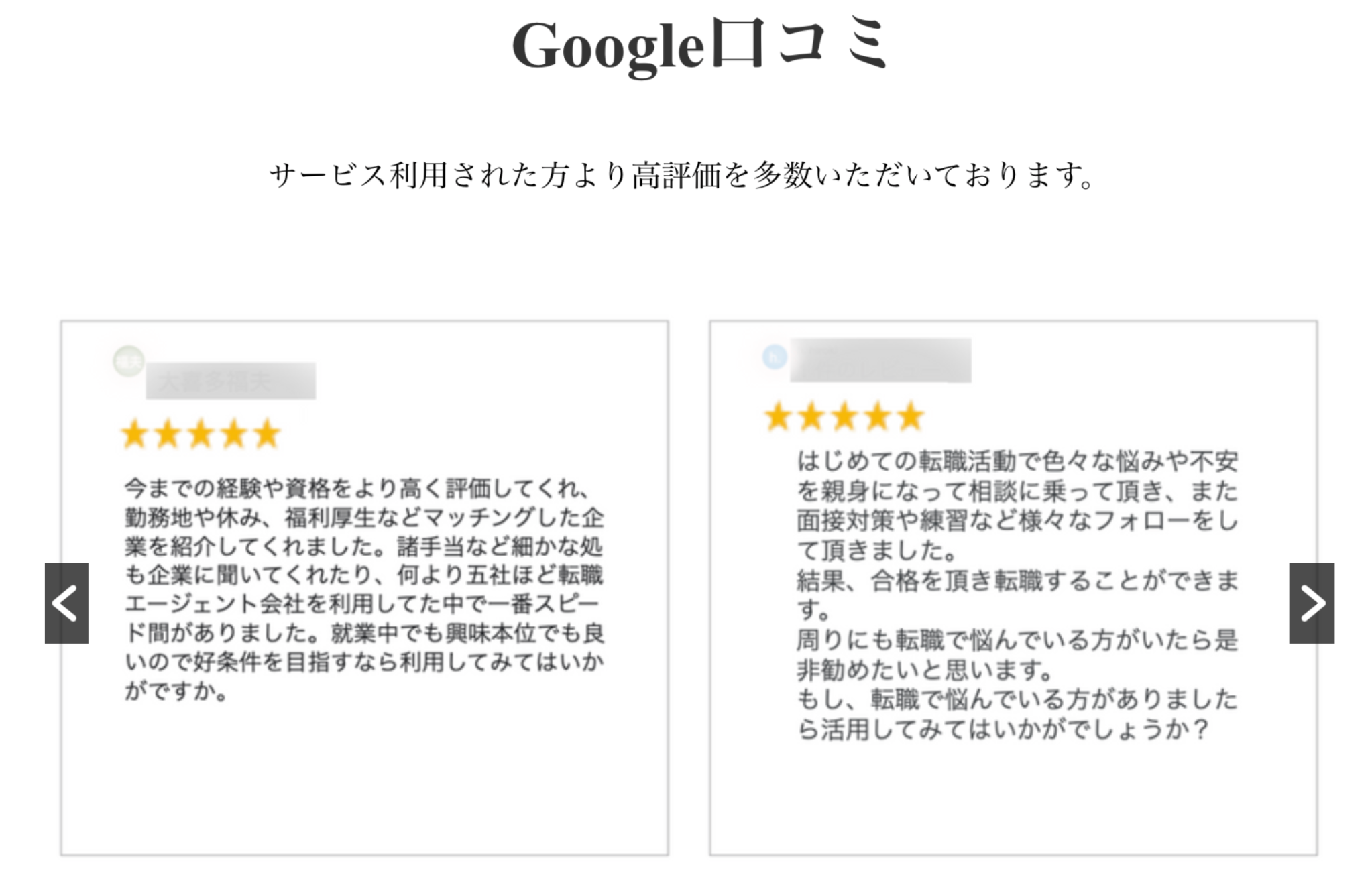 実際に当社の転職サービスを利用された方々から好評をいただいており、クチコミの評価で満足度として95%となっております。