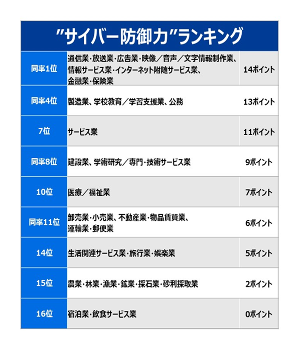 ※ 14個のチェック項目を有した「サイバー防御力チェックリスト」を用いて測定し、満点である14ポイントを獲得することで「サイバー防御力が一定水準である」と定義。チェックリストを用いて調査した結果を分析し、16業種の「サイバー防御力」をランキングとして発表。
