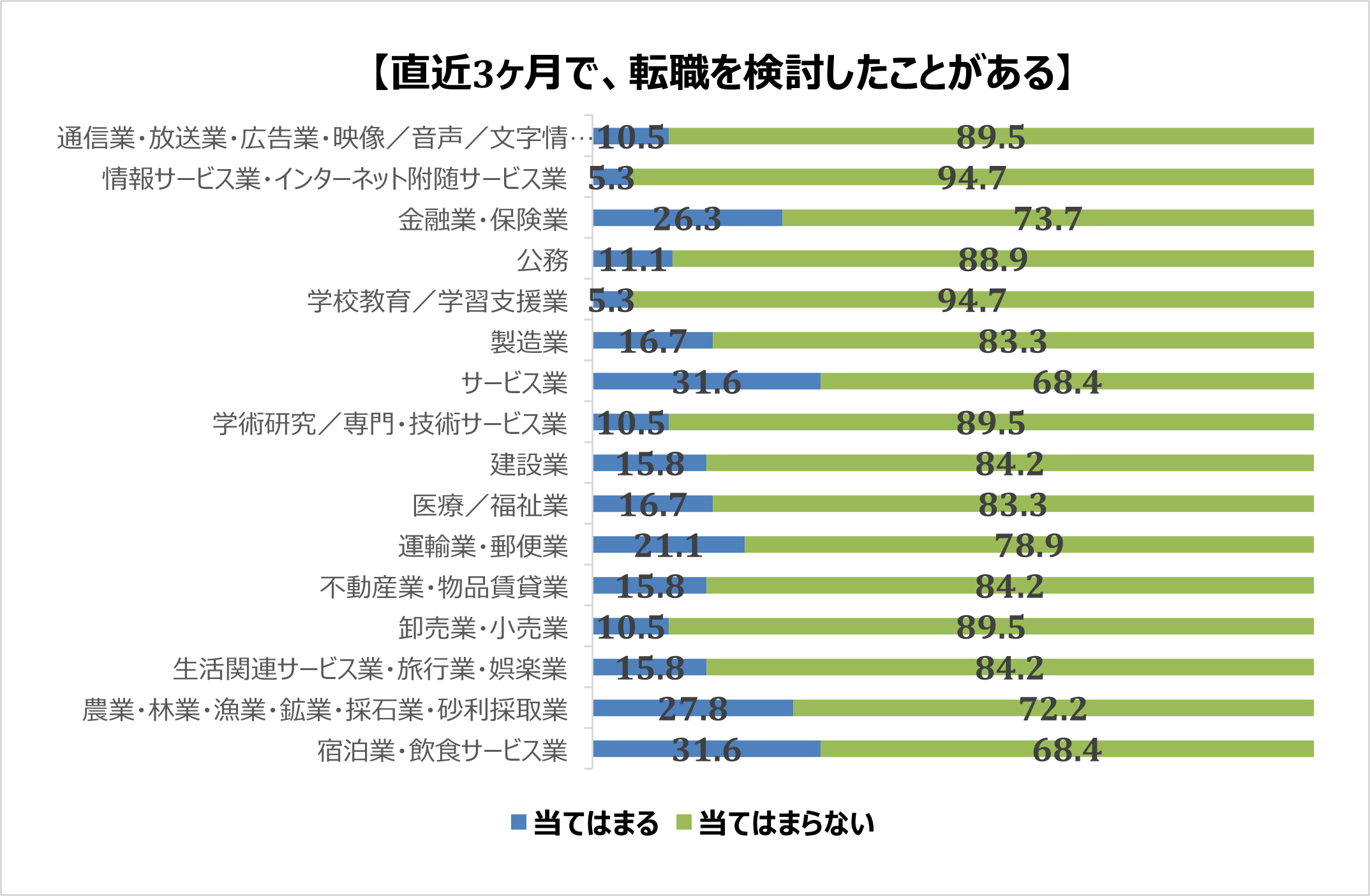 その様な状況下、今回の調査では「直近3ヶ月で転職を検討したことがありますか」という質問に対して「当てはまる」と回答したのは全体で16.7%という結果になりました。