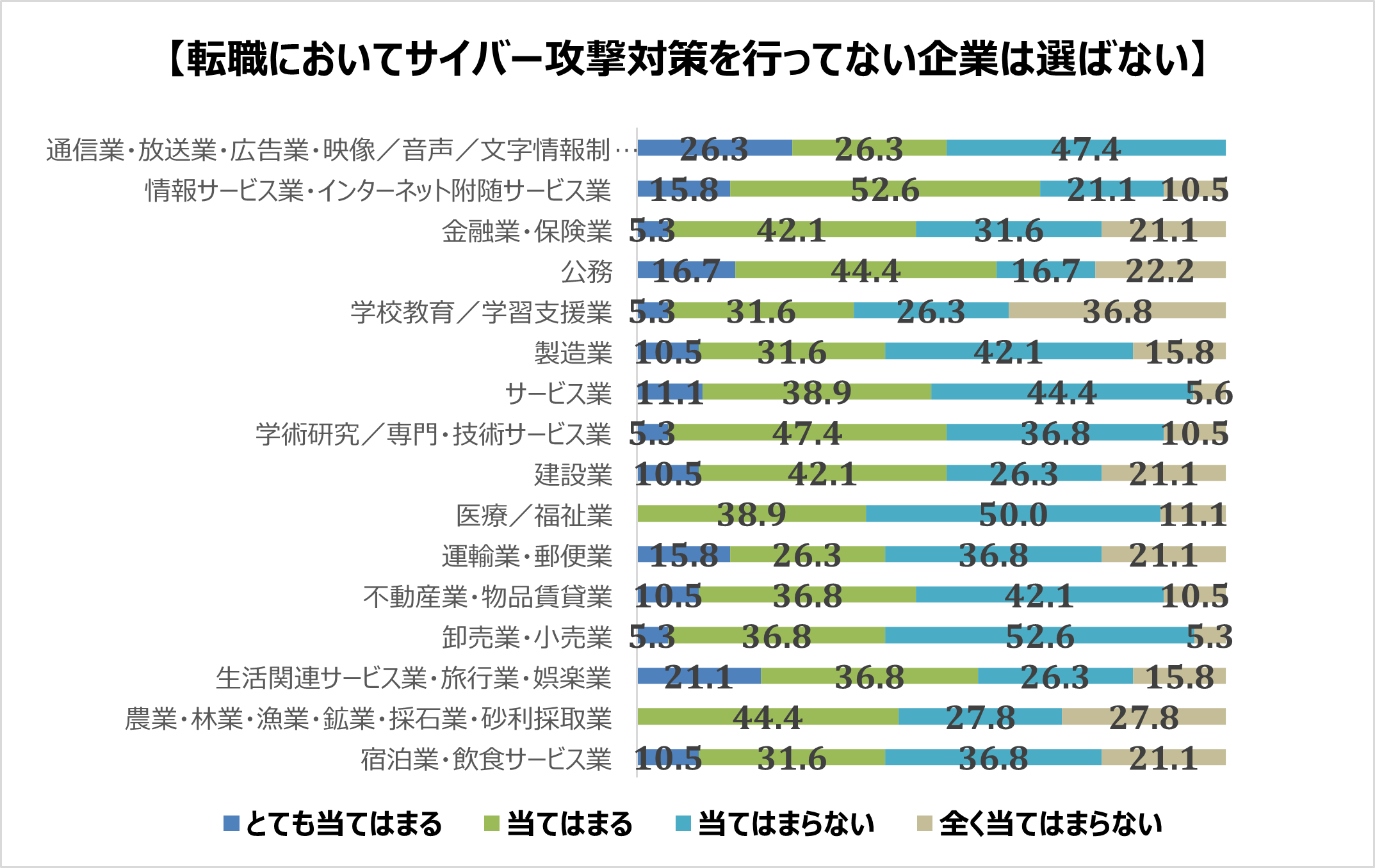 またそのように回答した人が多かった業種は順に「情報サービス業・インターネット附随サービス業(68.4%)」「公務(61.1%)」「生活関連サービス業・旅行業・娯楽業(57.8%)」に続き「製造業」「通信業・放送業・広告業・映像/音声/文字情報制作業」「学術研究/専門・技術サービス業」で52.6%となり「生活関連サービス業・旅行業・娯楽業」以外は、サイバー防御力が比較的に高い業種ということが判明しました。これからは人材獲得のために、どの業種でもサイバー攻撃対策が必要になってきていると言えます。