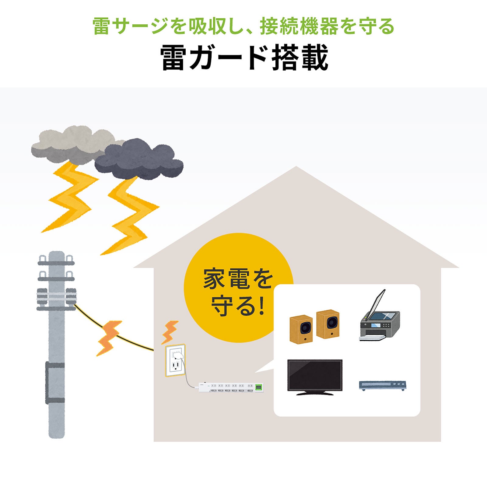 さらに、雷サージ対策のため、サージ吸収素子(バリスタ)内蔵です。耐サージ機能確認用LED緑色ランプが付いており、目視で確認できます。