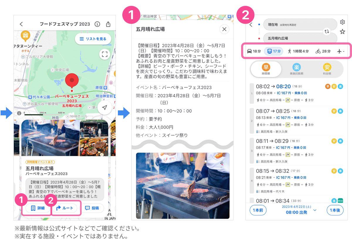 ・地図上で調べたいスポットのピンをタップすると、画面下部に、「詳細」ボタン、「ルート」ボタン、「投稿」ボタンが表示され、ボタンをタップすると遷移します。「詳細」ボタンをタップすると、イベントの詳細情報が表示(※5)されます。(開催日程、開催時間、概要、イベントの詳細情報など)