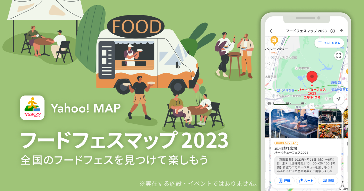 ヤフー株式会社(以下、Yahoo! JAPAN)が提供する「Yahoo! MAP」(iOS版、Android版)は本日、春の大型連休を中心に全国で開催される(※1)食に関するイベント情報が地図上で確認できる「フードフェスマップ 2023」(以下、本機能)の提供を開始しました。本機能では、地図上で該当スポットの詳細情報の確認やルート検索なども可能です。