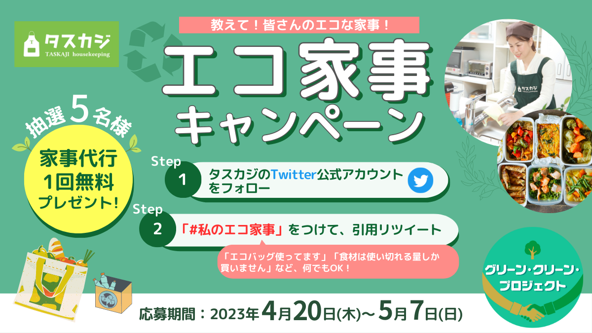 タスカジではグリーン・クリーン・プロジェクトに合わせ、4月20日(木)〜5月7日(日)の期間で「エコ家事キャンペーン(https://corp.taskaji.jp/information/news/2023/04/20/ecokaji2023/)」を実施します。