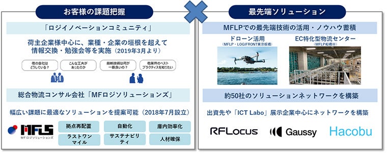 「MFLP &Logiソリューション」は、物流に関する課題に悩む企業に対し、ハード(物件・設備)とソフト(三井不動産の知見、物流コンサルティングファームであるMFLSのノウハウ、パートナー企業とのネットワーク等)の両面により、解決へと導くのはもちろん、その先の成長戦略をも支援するコンサルティングサービスになります。