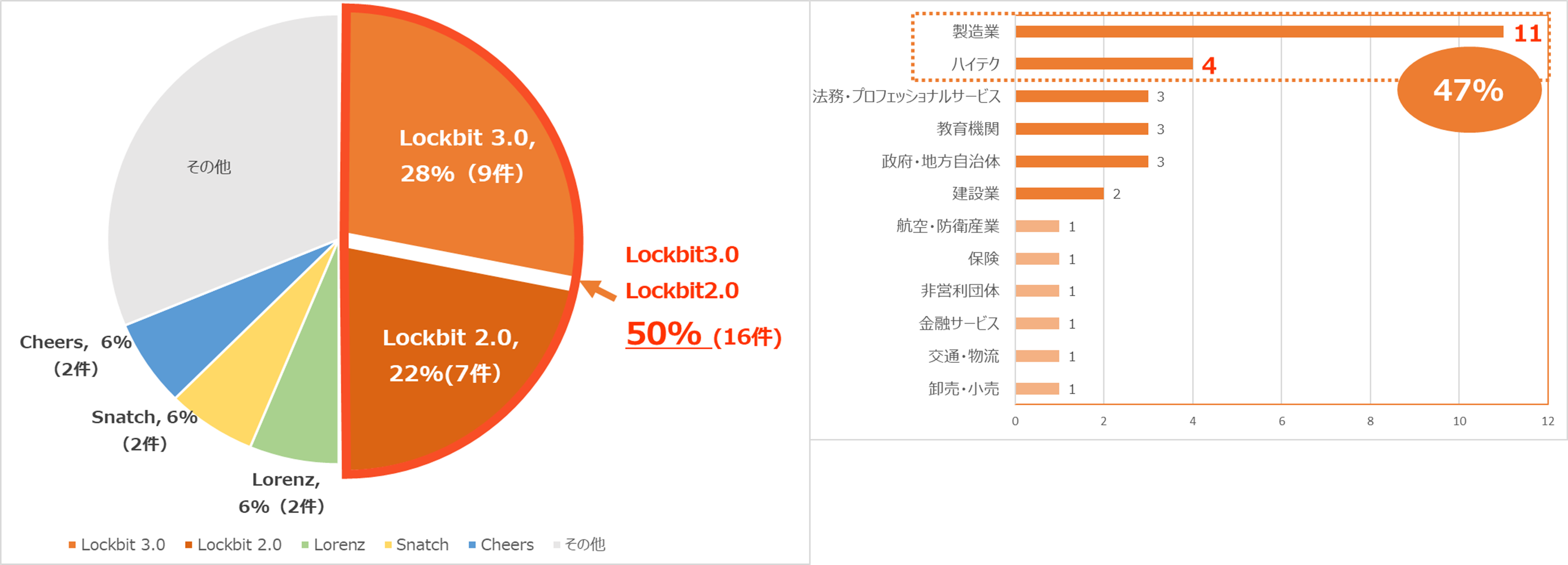 - 脅威アクターはLockbitが全体の半数を占める: Lockbit3.0(9件)が最多、次いでLockbit2.0(7件)