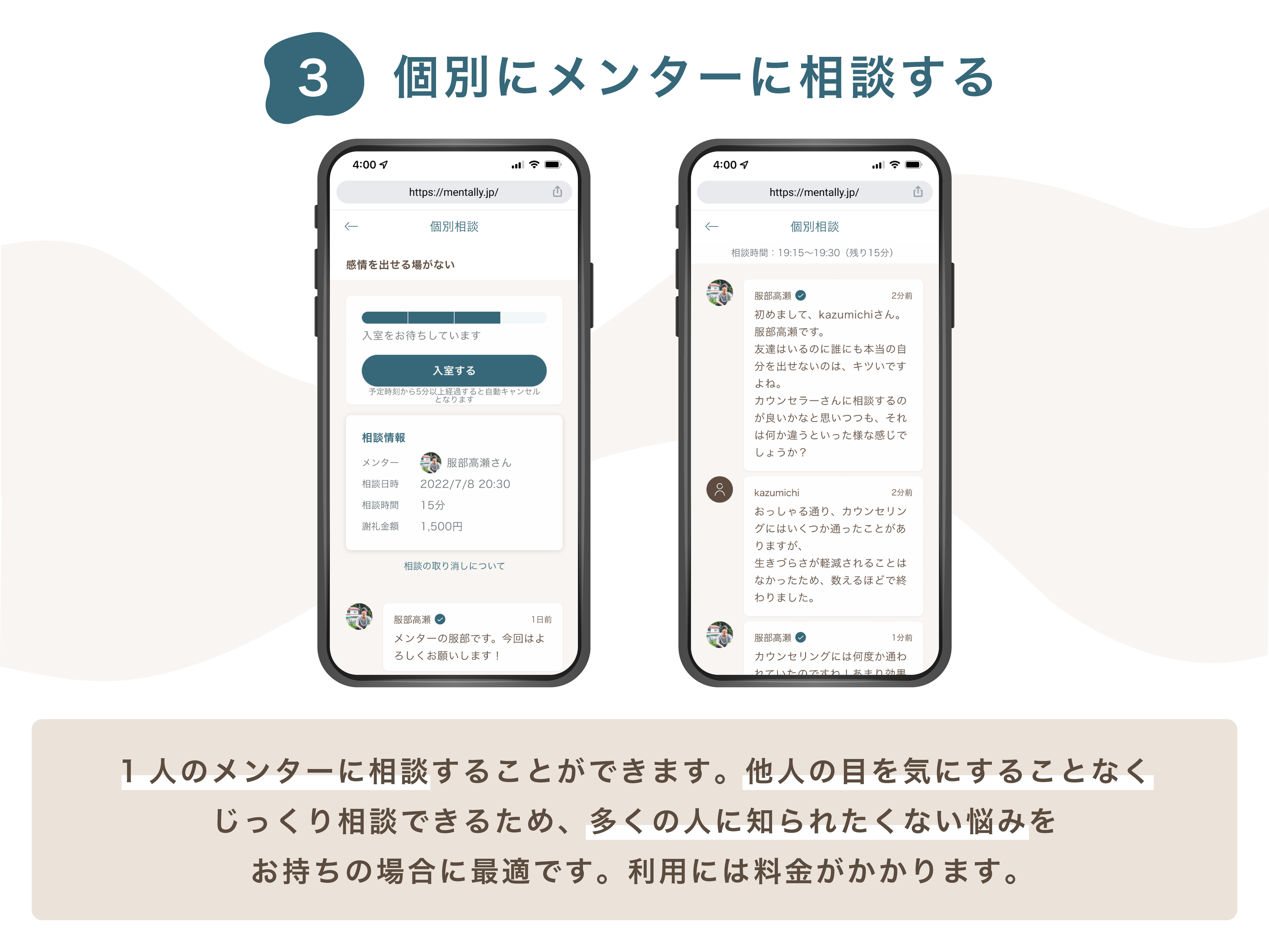 相談者は全メンターに相談するか、個別に相談するかを選ぶことができます。個別相談では、運営側が相談者に合ったメンターを選び、1対1でリアルタイムで悩みを聞いてもらえます。メンターとの継続的な対話をきっかけに、相談者の不安を払拭することができると考えています。全メンターへの相談とは違い、他人の目を気にすることなくじっくり相談できるため、多くの人に知られたくない悩みをお持ちの場合に最適です。(本機能には、利用料金がかかります。)