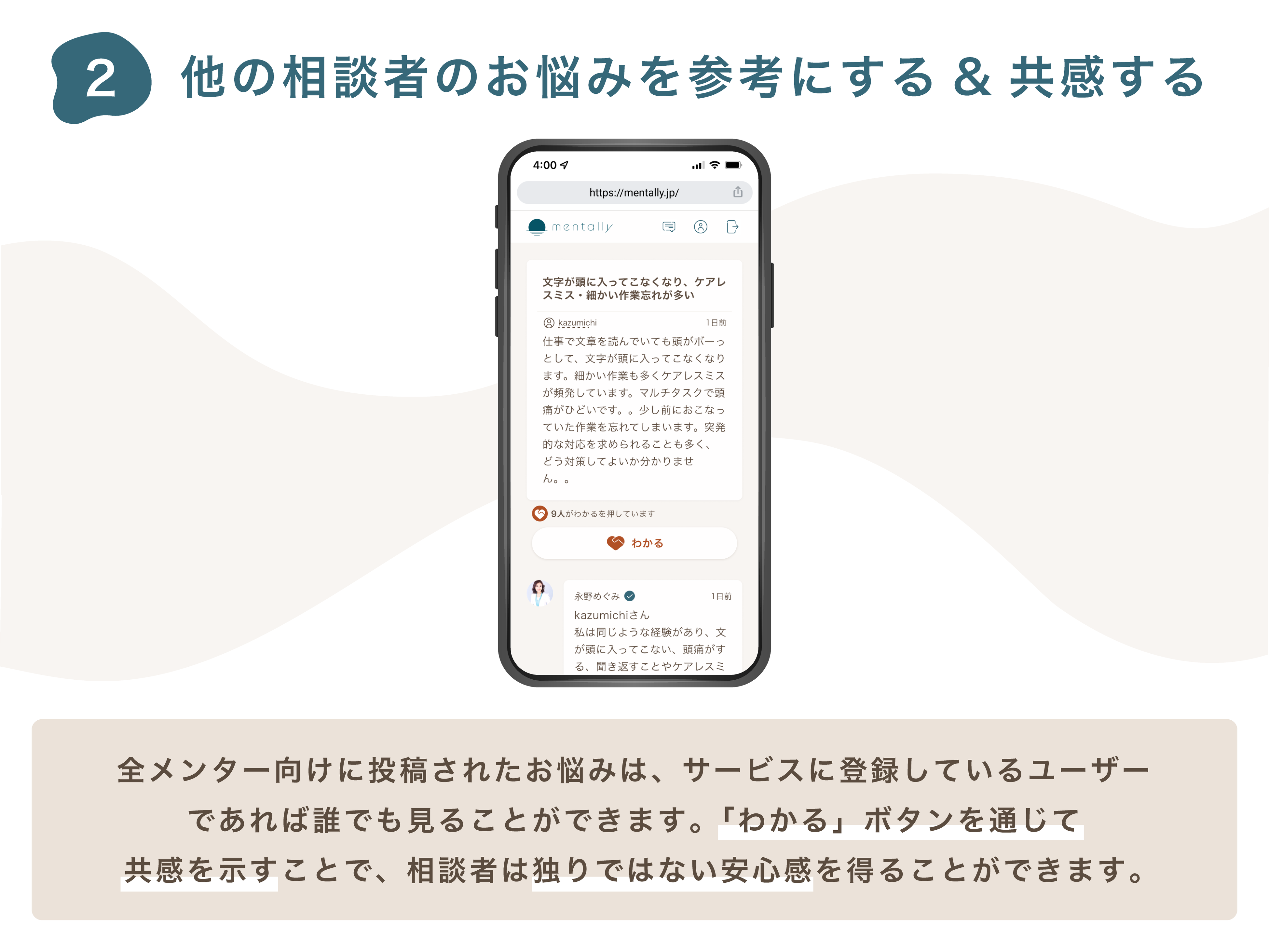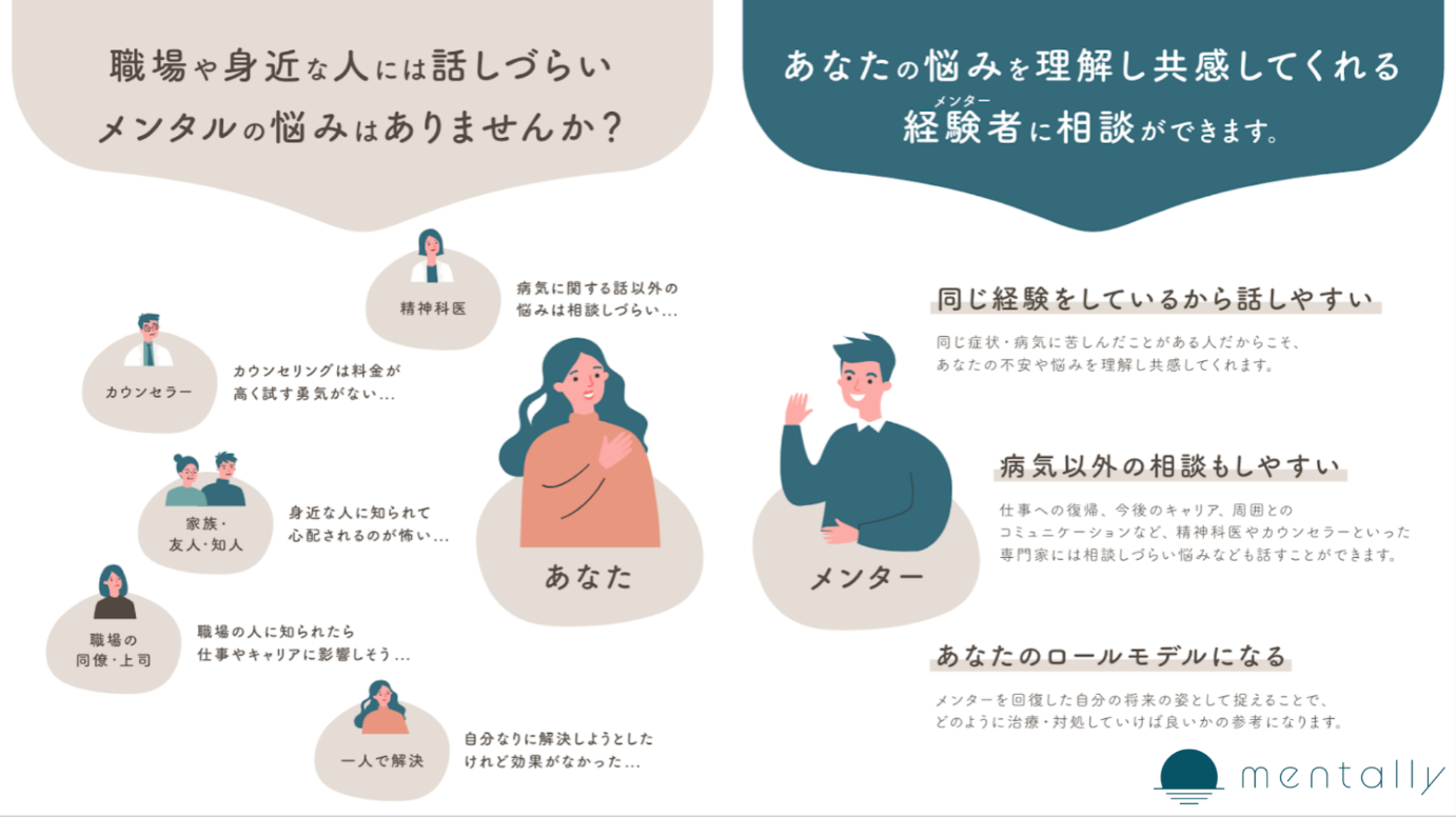 「mentally」はピアサポートに特化したこころのオンライン相談Webアプリです。ピアサポートとは、同じ悩みや病気に苦しみ、乗り越えた経験を持つ当事者に話を聞いてもらうこと、経験談を聞くことで治療や症状の改善に役立てる手法です。
