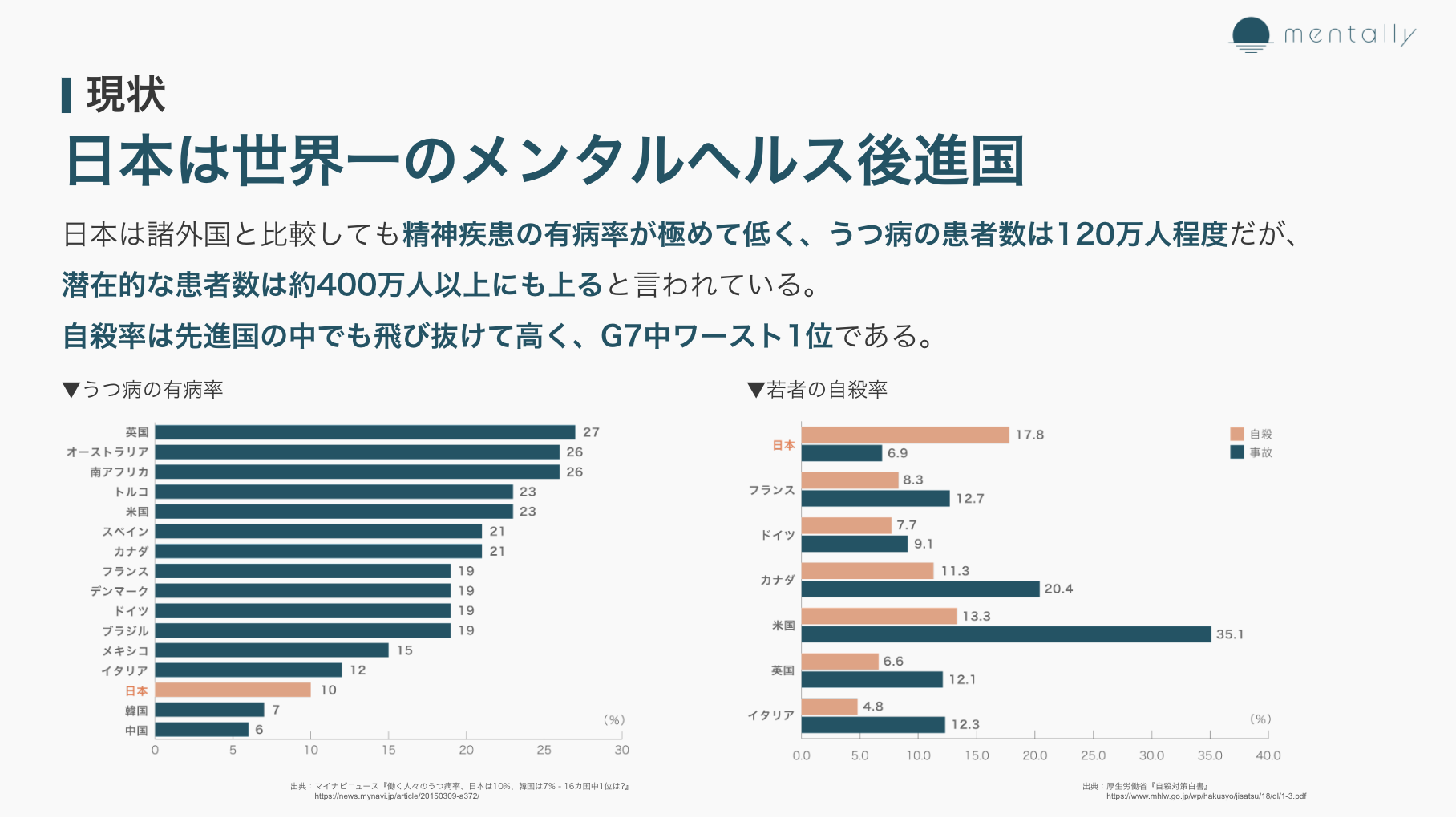 いま、メンタルヘルス/ウェルビーイングは世界共通の社会課題となっています。日本は諸外国と比較しても精神疾患の有病率が低く、うつ病の患者数は120万人程度ですが、潜在的な患者数は約400万人以上にも上ると言われています。また、自殺率は先進国の中でも飛び抜けて高く、G7中ワースト1位です。コロナ禍により、さらにメンタルヘルスは悪化しており、うつ病・うつ状態の人の割合はコロナ禍以前と比較して2.2倍に増え、約6人に1人(17.3%)に達しています(OECD調査、2021年)。