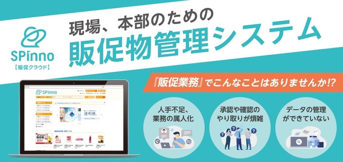 商品・サービスの魅力を伝えるため、「売る」現場では必要不可欠なパンフレット・POP・ポスター・パネルといった販促アイテム。販促クラウド「SPinno」は、それらの販促アイテムのデータ管理・共有、デザイン修正、本部への申請・承認、印刷会社への印刷発注、在庫管理までを一元管理できるクラウドサービスです。