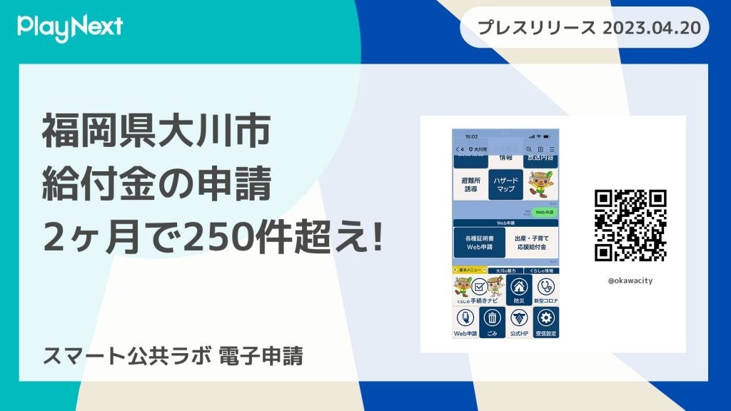 2023年1月18日に福岡県大川市で九州地方として初となる「スマート公共ラボ 電子申請」のサービスが開始されましたが、今後も「住民票の写し」「戸籍謄本・抄本」「印鑑登録証明書」「課税証明書」など、さまざまな申請手続きにも対応し、さらなる生活の質の向上に努めてまいります。