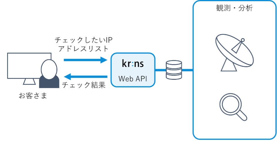 お客さまがチェックを行いたいIPアドレスと、kr:nsが保有するMalicious IPアドレスリストとの突合を行い、マッチングしたIPアドレスについては、悪性と判定した根拠データとともに返します。
