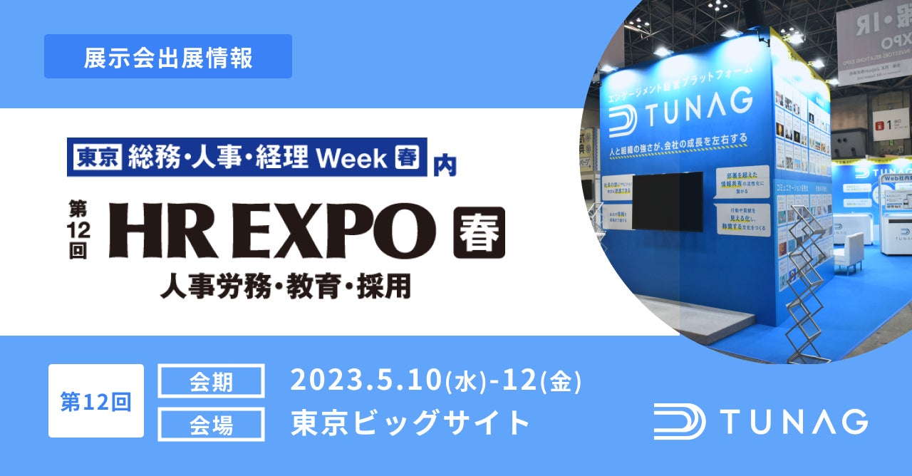 株式会社スタメン(本社:愛知県名古屋市、代表取締役:大西 泰平、以下 スタメン)が自社で開発・提供する、エンゲージメントプラットフォーム「TUNAG(ツナグ、 https://biz.tunag.jp/)」は、2023年5月10日(水)~12日(金)に東京ビッグサイトで開催される「第12回 HR EXPO(人事労務・教育・採用) [春]」に出展することをお知らせいたします。