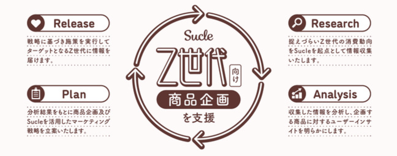 Z世代向けの商品企画を実施しております。SucleはZ世代を中心としたユーザー構成であり、編集部もZ世代のメンバーであることから、企業様のZ世代向け商品の開発や、Z世代向けの集客をお手伝いさせていただいております。