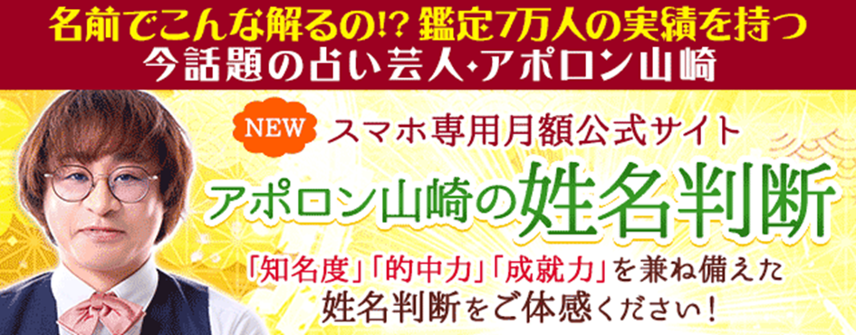圧倒的な的中力を誇る占い芸人「アポロン山崎」の本格姓名判断サイトが遂に登場。あなたやあの人の名前の画数で、生まれ持った運命やこの先の運勢、2人の絆など知りたいことを全て明らかにしていきます。さらに毎日変わる2人の相性鑑定など豊富な種類の占いをご用意しました。芸能界絶賛の的中力・成就力を誇る鑑定をぜひご体験ください。
