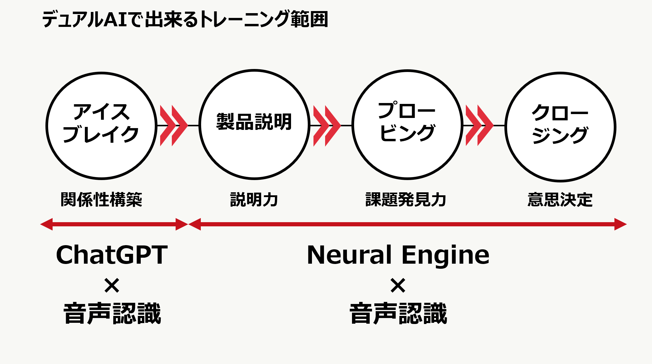 この『デュアルAI』は、今まで実現が難しいとされていた商談冒頭のアイスブレイクを可能としたことで、速やかな顧客との関係性構築を支援し、クロージングまでを最速化します。