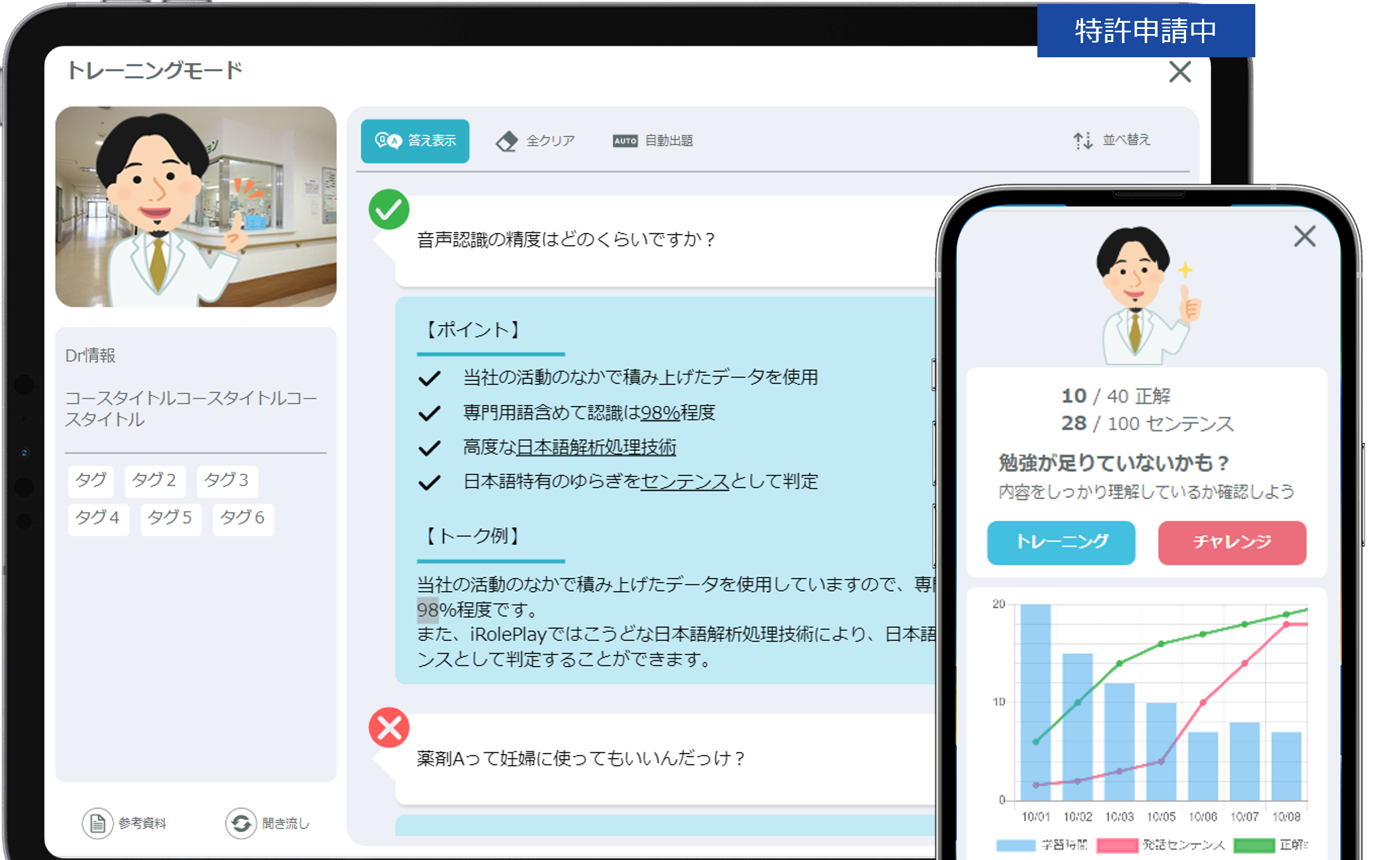 人による曖昧な評価ではなく、実際の営業話法に基づいた判定をAIが行うため、課題が明確になり、短時間で効率的な営業スキル向上が実現できます。対応デバイスがあれば、いつでもどこでもセルフトレーニングが可能です。既に大手製薬企業数社への導入が決定、さらに損保・生保業界などからの引き合いもあり、様々な営業職種への展開も視野に入れています。今後1年で20社への導入を見込んでいます。