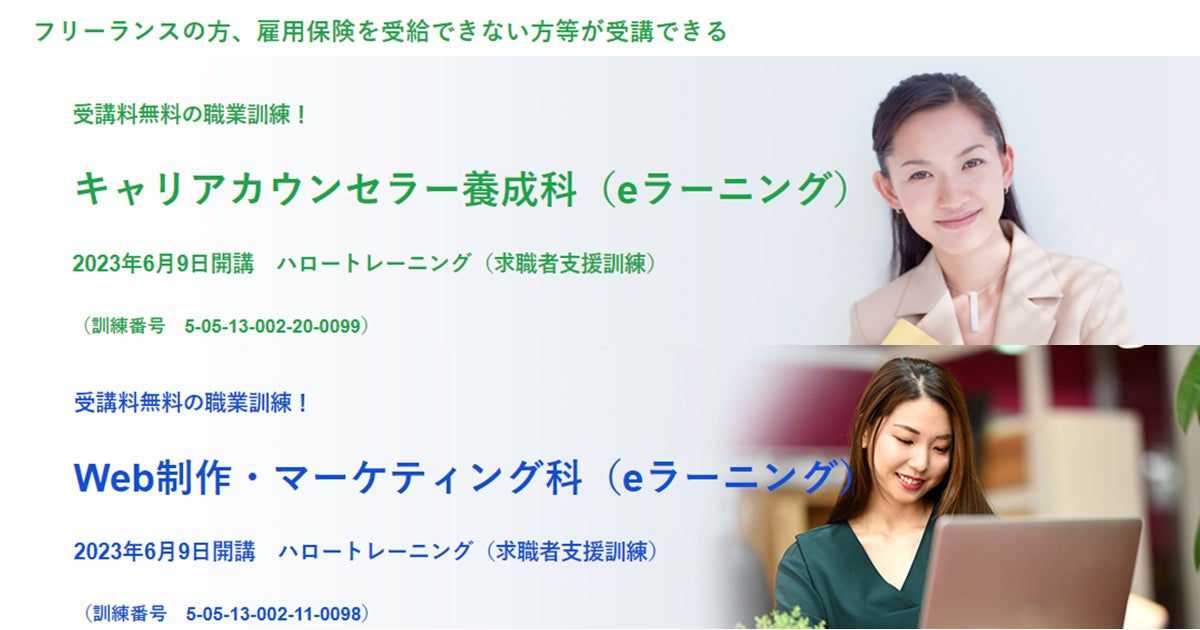 - ハロートレーニング「キャリアカウンセラー養成科(eラーニング)B-36」(6月9日開講・4か月訓練)「Web制作・マーケティング科(eラーニング)B-32」募集概要