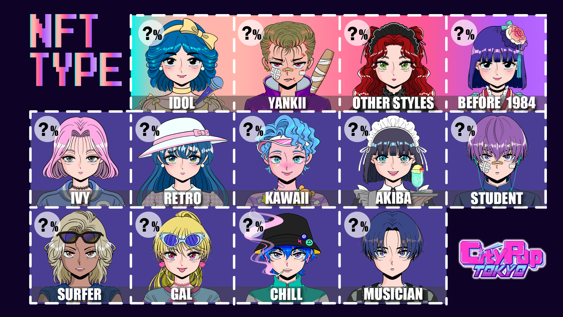「City Pop TOKYO」のNFTキャラクターたちは、着ている洋服や見た目のスタイルでタイプが分かれています。タイプによってレアリティが違い、レアリティ詳細は今後公式twitterアカウントやdiscordで発表予定です。