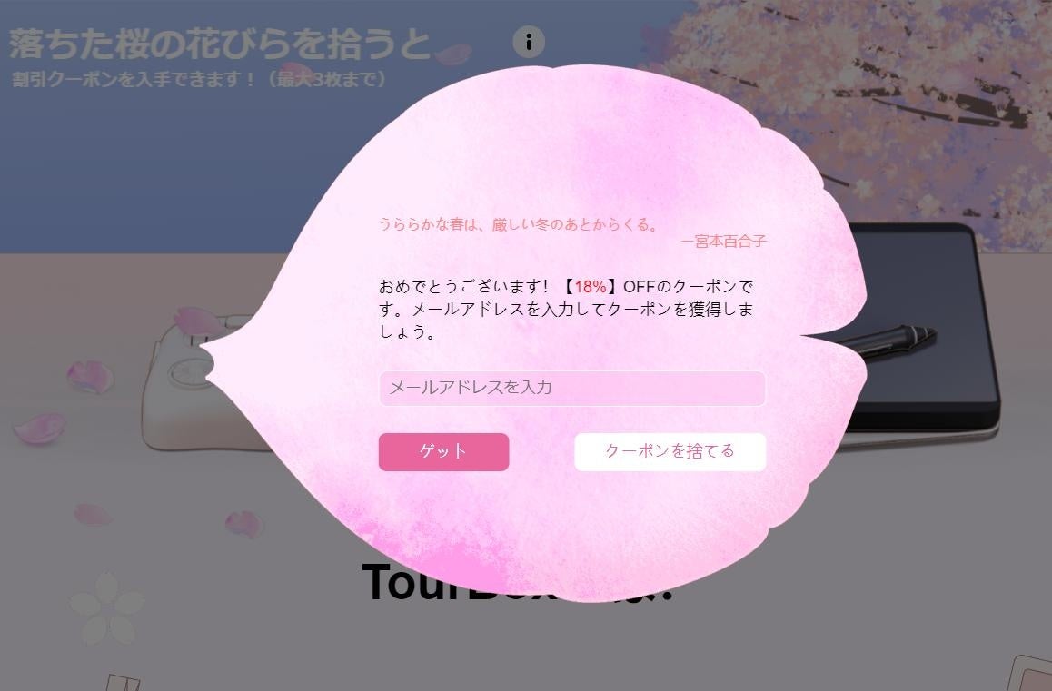 キャンペーンページから桜の木をクリックして、落ちた花びらを拾うと割引クーポンを入手できます。最大割引は20%です。