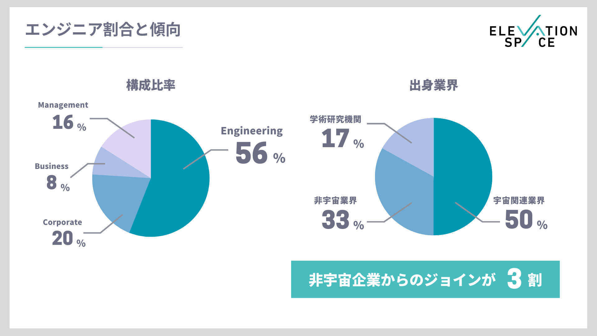 部門別の構成比率としては、Engineering部門が全体の56%を占め、そのおよそ半数が宇宙関連業界出身のメンバーですが、JAXAや大学等における研究職出身者が17%、非宇宙業界からの入社が33%を占めます。