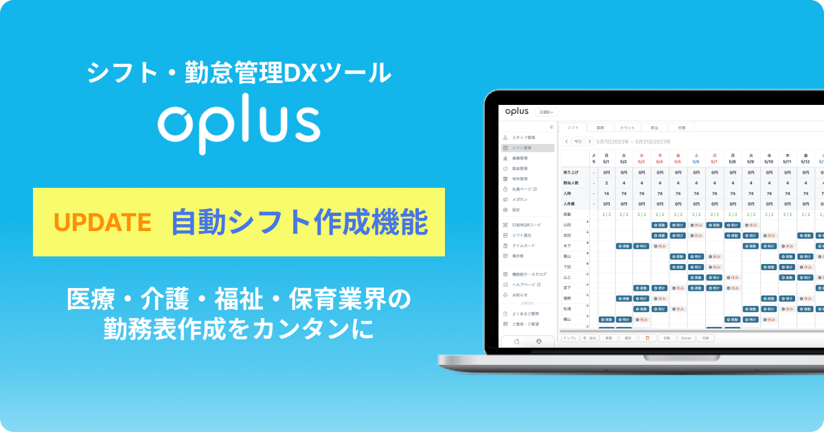 「oplus」では、こうした医療・介護・福祉・保育の業界における勤務表作成の課題を解決するため、自動シフト作成機能を大幅にアップデートいたしました。自動シフト作成機能により、透明性・公平性の高いシフト運用を実現すると同時に、勤務表作成における業務を大幅に削減します。